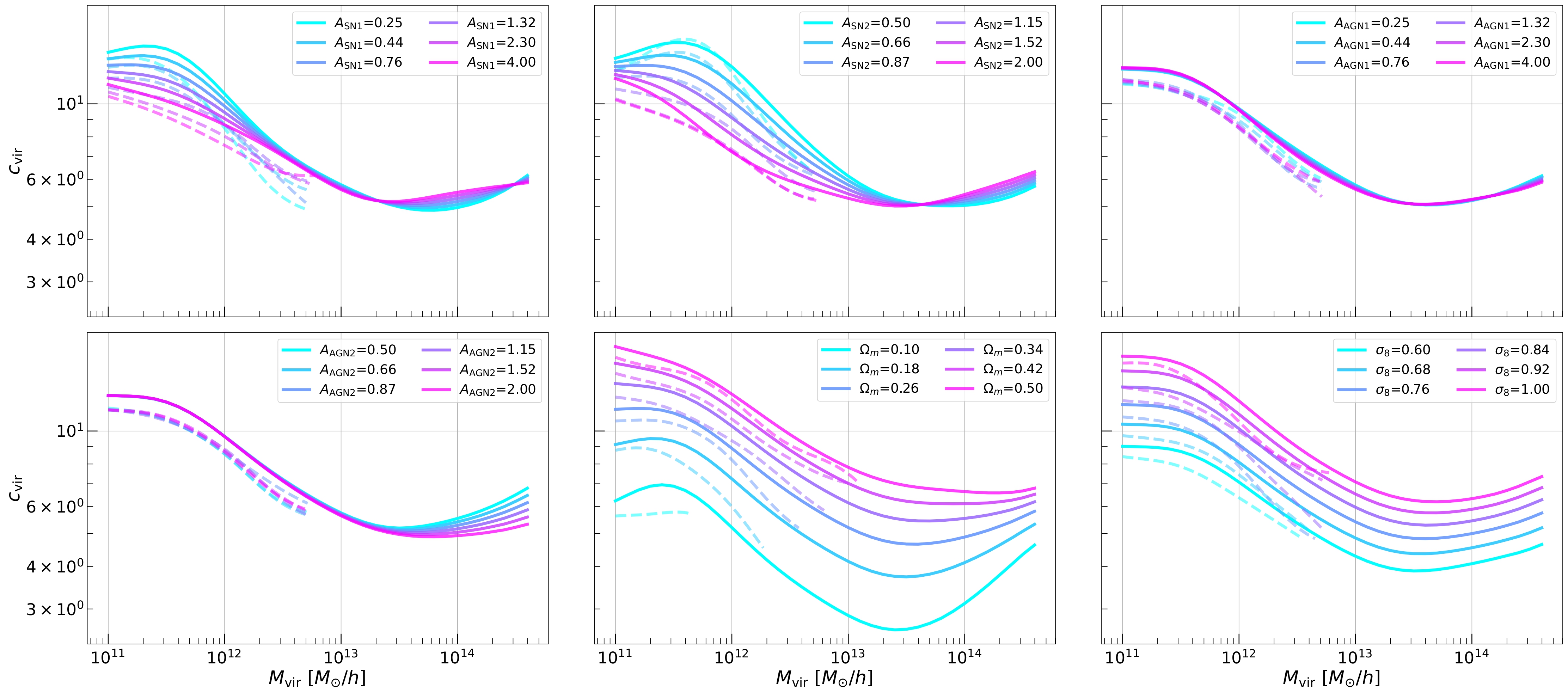 Figure 6 in Shao, Anbajagane, and Chang 2022. Variations in the concentration mass relation as you vary six paramters from the CAMELS suite.
